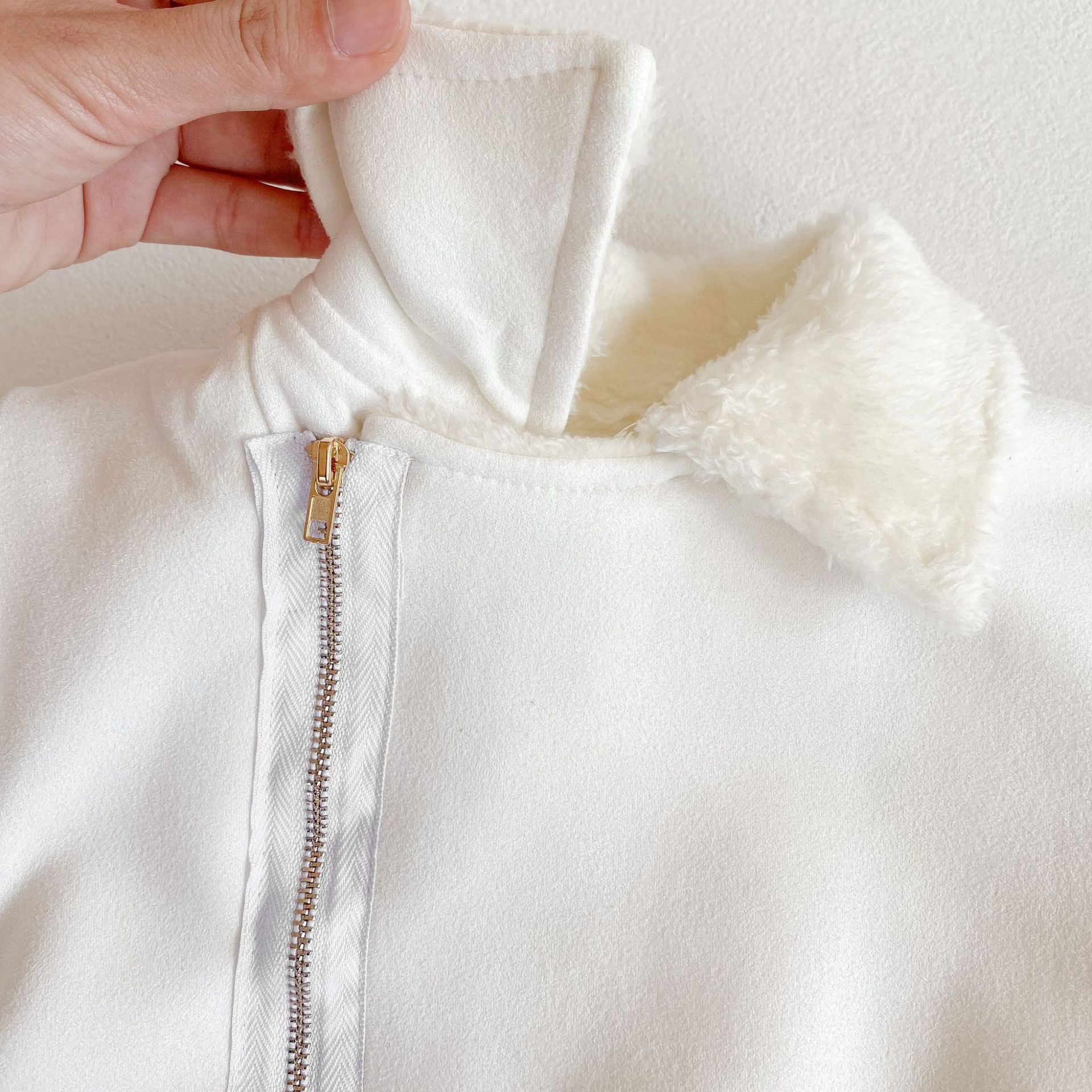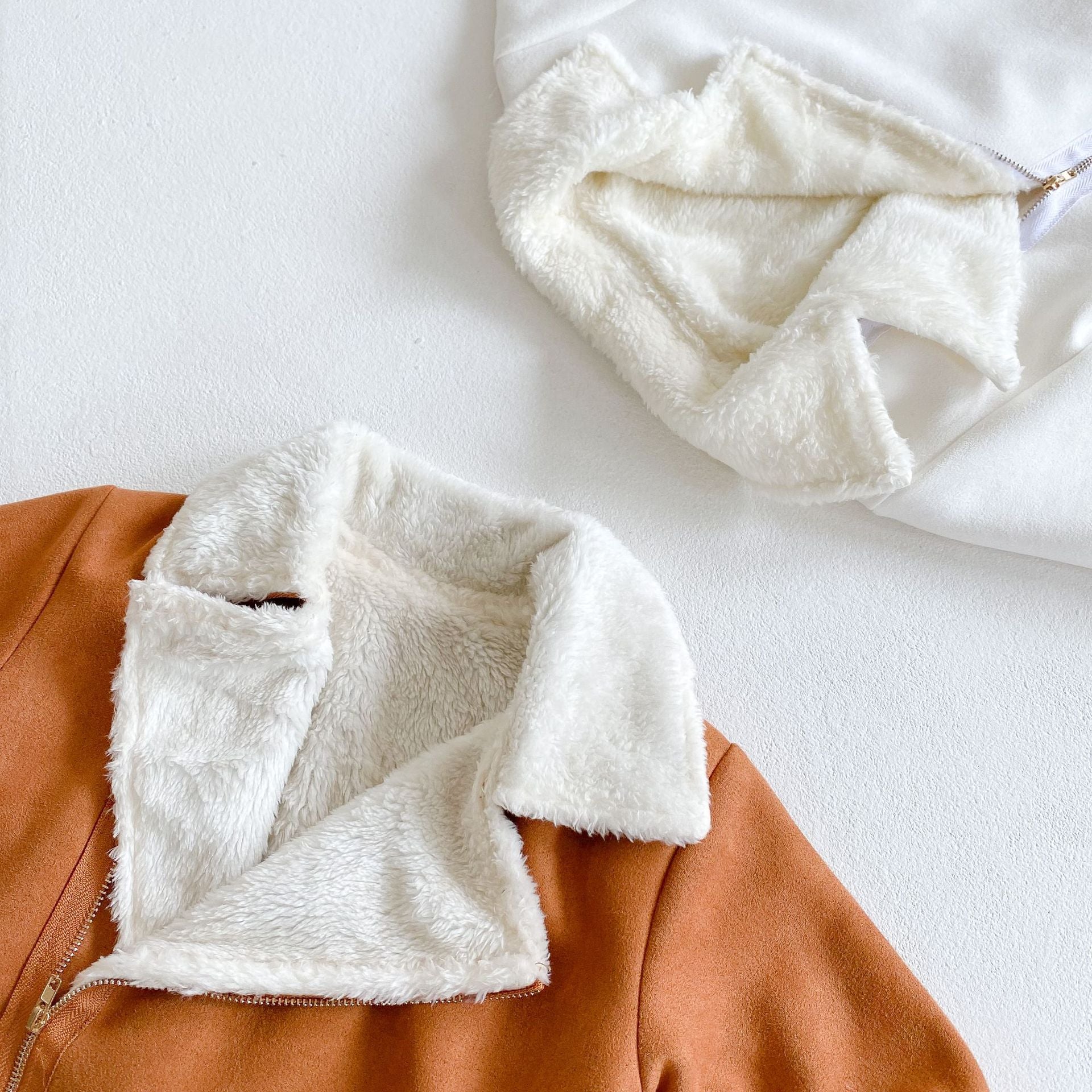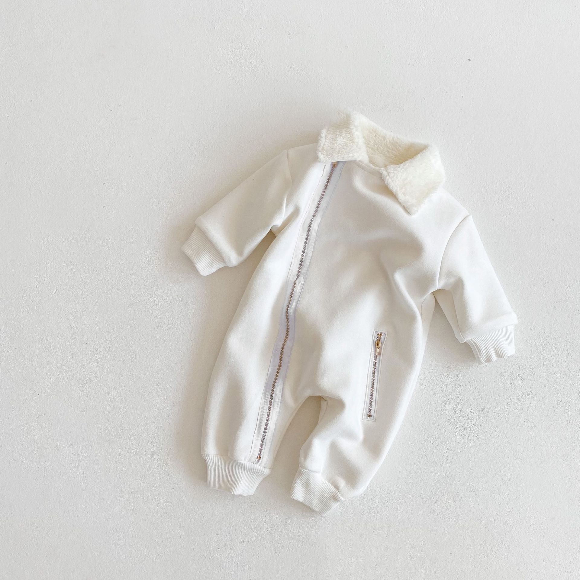 Perfect for colder days, a zip up bodysuit with a suede outer and soft faux fur lining. Ribbed cuffs and stylish hardware make this the ultimate winter must-have. Easy to put on and zip up and go! If outfit will be layered with other clothes under, we advise sizing up. Available in snow and bronze.